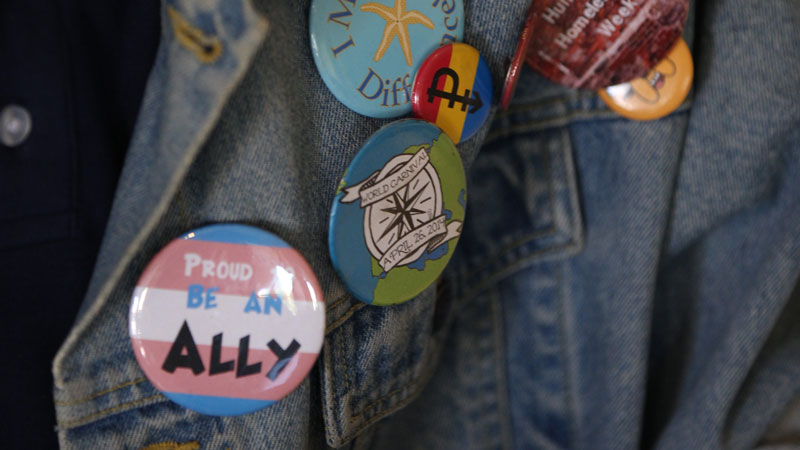 Student jacket with buttons supporting different causes